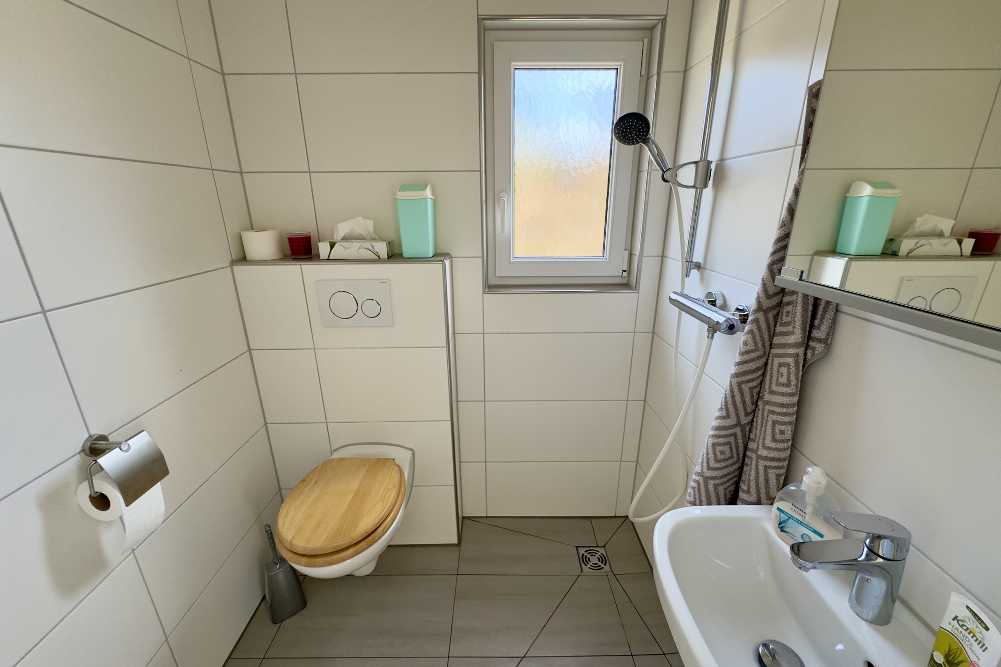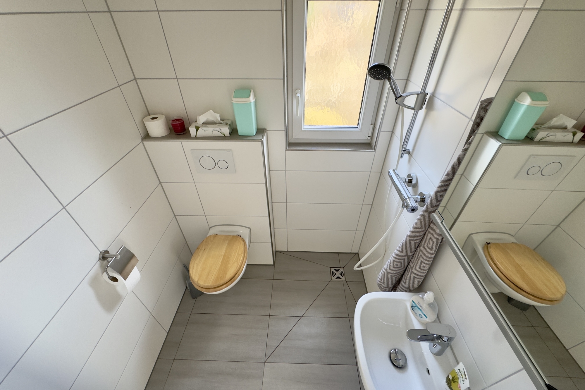 •Badezimmer mit ebenerdiger Dusche, WC und Waschbecken