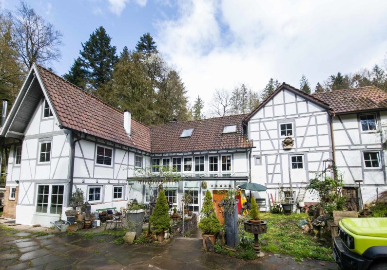 Ruhig von Wäldern umgeben liegt das Anwesen auf einer Lichtung mit dem großen Wohnhaus und seinen Nebengebäuden. Der Haselbach fliest malerisch um das Grundstück und die Zufahrt zum Grundstück ist durch einen öffentlichen Weg gesichert.