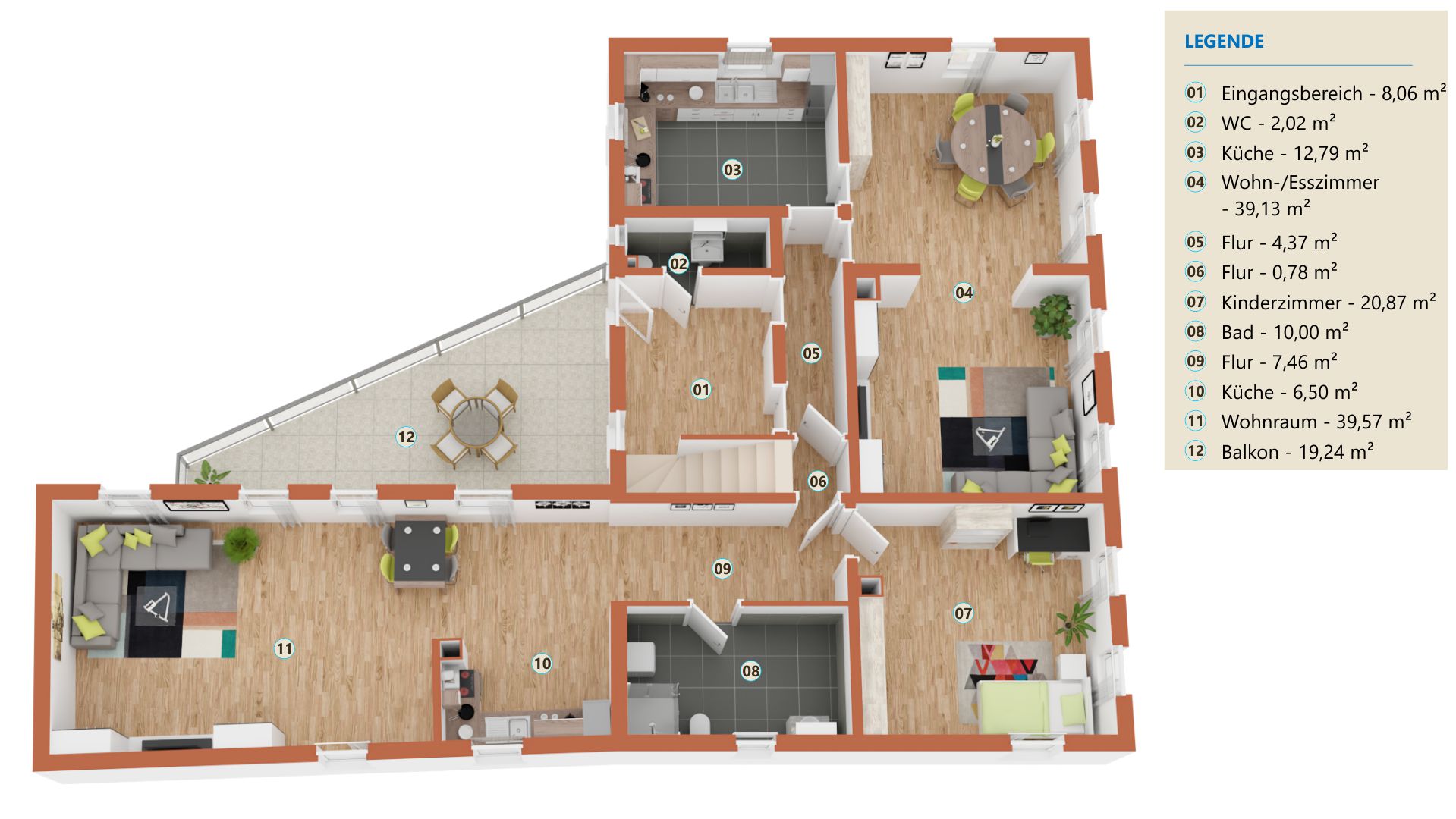 Die Hauptwohnung erstreckt sich über zwei Etagen mit 236 m² und kann als eine große Einheit oder zwei separate Wohnungen genutzt werden. Zwei separate Eingänge sind vorhanden. Die kleinere Einheit bietet ca. 85 m² mit vorbereiteten Küchenanschlüssen und eigenem Tageslichtbad. Die größere Wohnung umfasst ca. 152 m² mit lichtdurchfluteten Räumen.